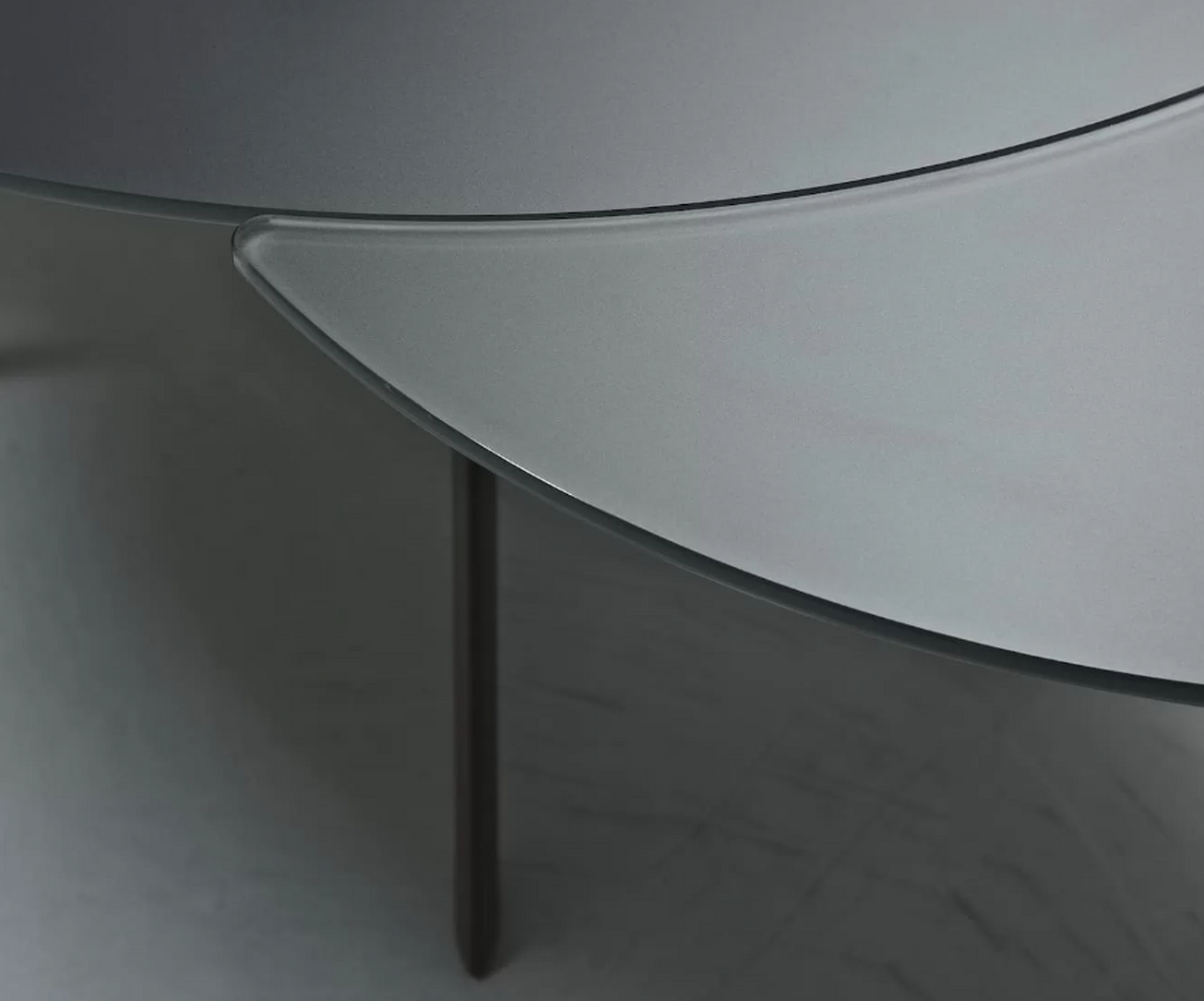 A round extending table with a polished crystal top, extensions in glossy glass and a velvet matt anti-scratch lacquered glass. The frame comes in a variety of metal finishes.