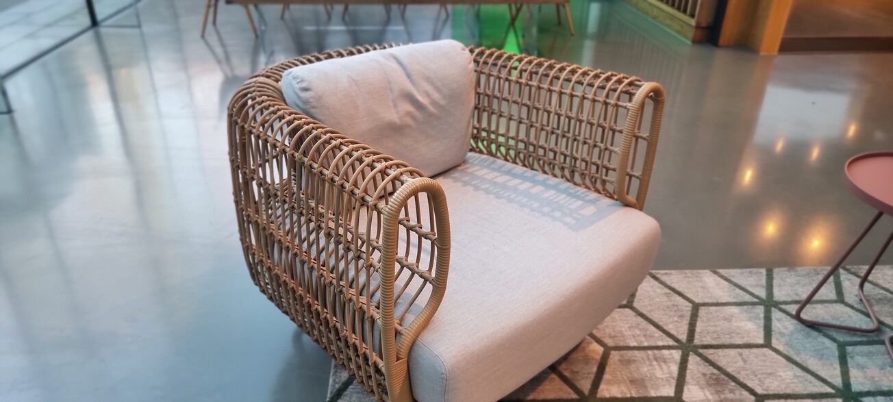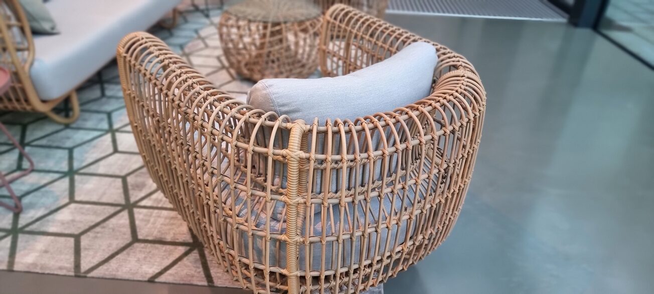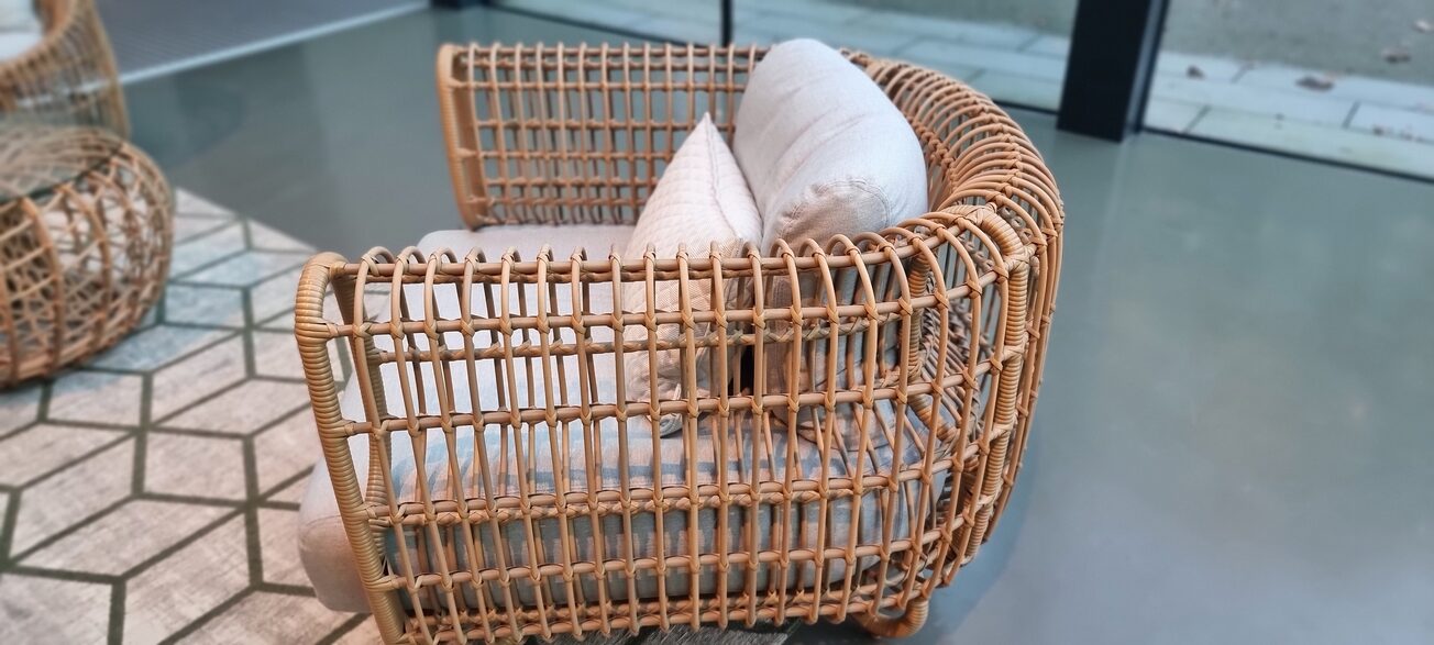 In natural, medium round weave with light grey Cane-line AirTouch cushions, equipped with QuickDry & Airflow technology, ensuring both luxurious comfort and fast drying after rain.